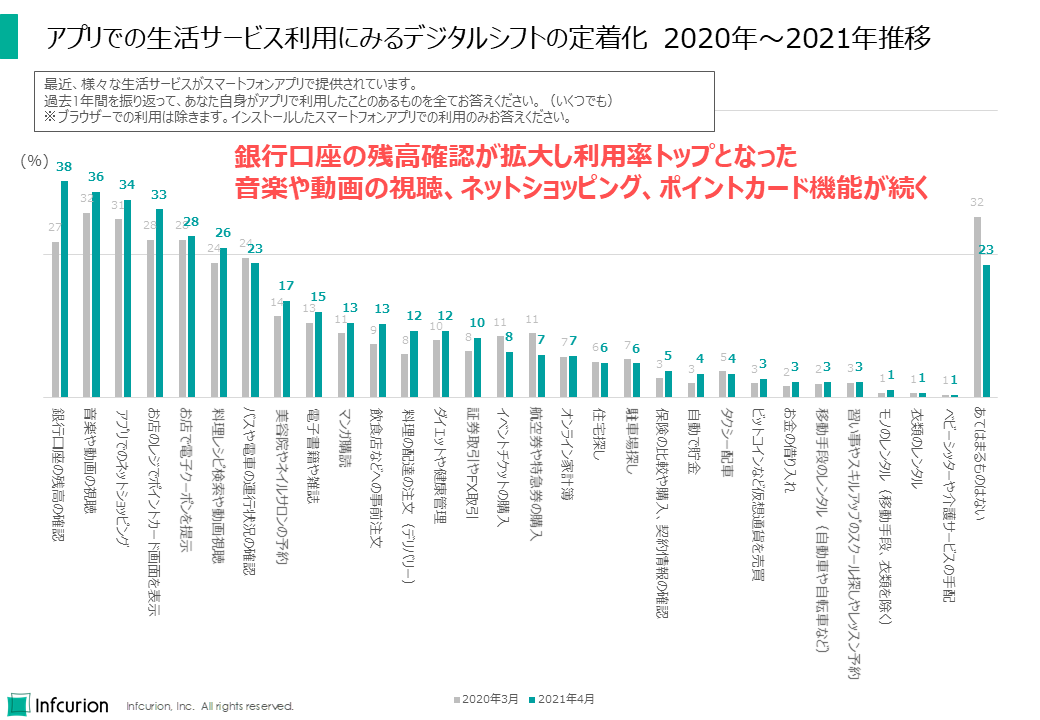 「銀行口座の残高確認」が38%(対前年11ポイント増)でトップとなりました。コロナ禍において、金融分野でのアプリ利用が急速に普及したことがわかります。