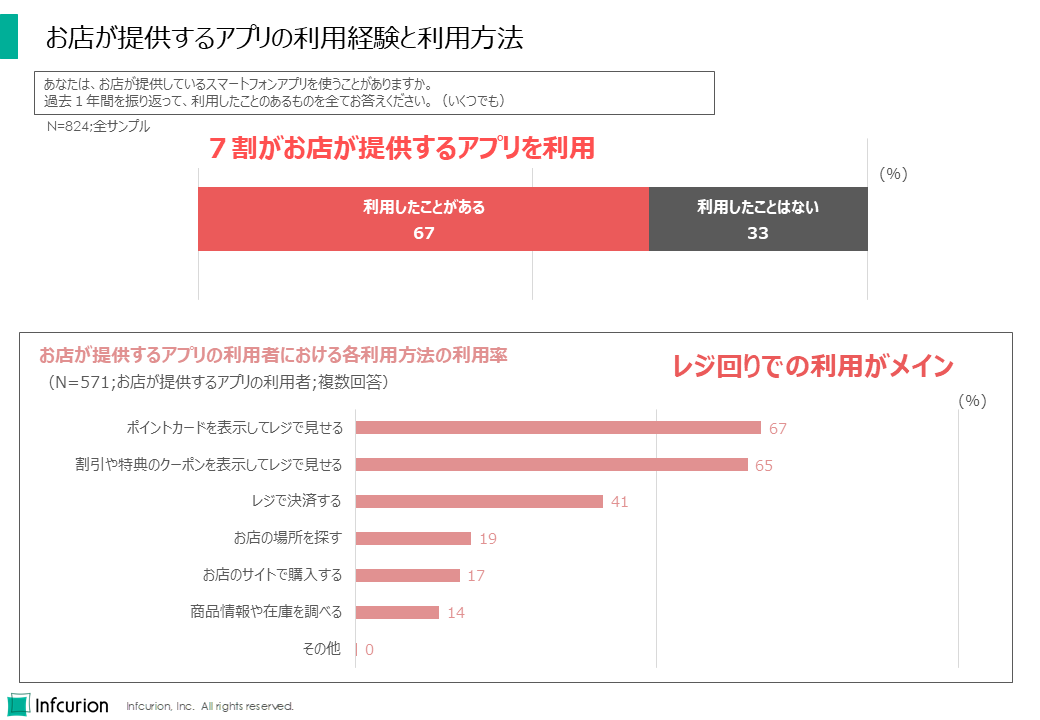 お店が提供するアプリは67%が利用経験あり。利用方法は「ポイントカードの表示」(67%)や「割引クーポンの利用」(65%)などレジ回りでの利用がメインとなっています。