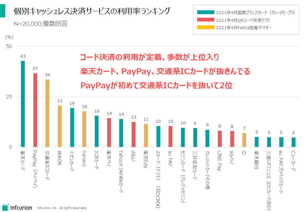 個別のキャッシュレス決済サービスの利用率は「楽天カード」が43%で首位の座を維持しています。