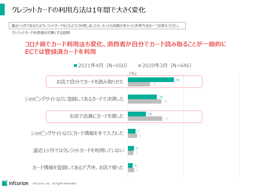 逆に1年前のトップ「お店で店員にカードを渡した」は今回は半減。