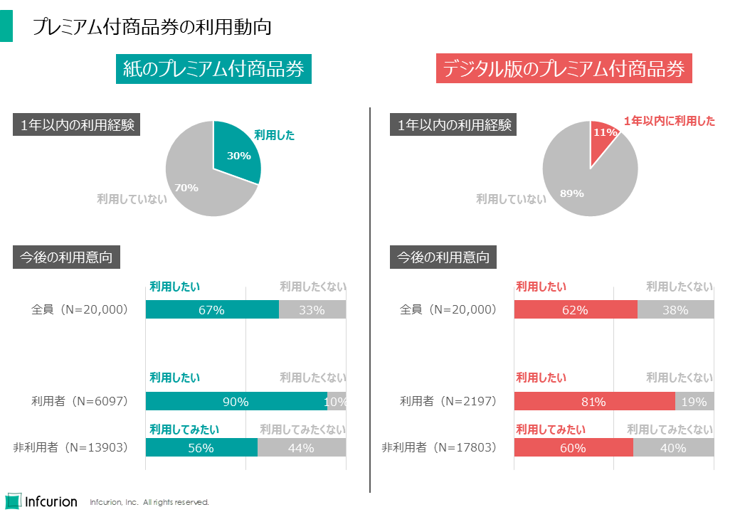 - 自治体が発行する「プレミアム付商品券」は紙版とデジタル版での利用率それぞれ30%と11%、今後の利用意向は紙版・デジタル版とも60%以上が利用を希望