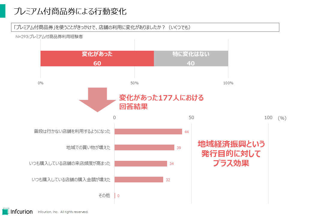 プレミアム付商品券の利用経験者に行動変化の有無を尋ねたところ、60%は「変化があった」と回答。主な変化として「普段はいかない店舗を利用するようになった」(44%)、「地域での買い物が増えた」(39%)が上位となり、地域経済振興という発行目的に対してプラスの効果が得られていることがわかりました。