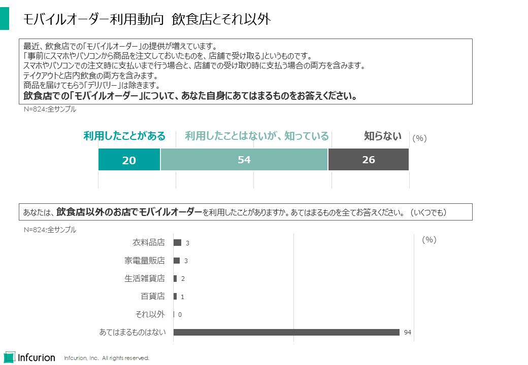 今回調査によると、飲食店でのモバイルオーダーは20%が利用経験あり。