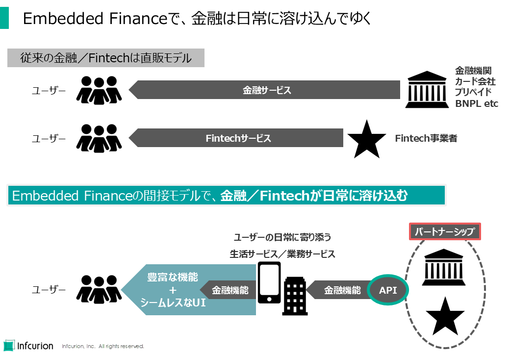 Embedded Financeとは、金融機能をAPI等を介して事業者に提供することで、事業者が自社サービスに金融機能を組み込む(embedする)取り組みです。これは、従来の「直販モデル」に対する「間接モデル」による新たな利用導線を生み出すものです。ユーザーが日常的に利用する生活サービスや業務サービスに金融機能が組み込まれることで、ユーザーがわざわざ意識することのない自然な金融利用の導線が実現しています。