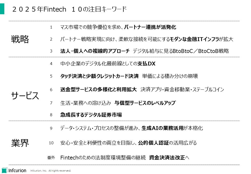 そして第3回では、恒例の「2025年フィンテック 10の注目キーワード」を解説していきます。(これまでの毎年の振り返り/展望は「年度総括」タグでご覧になれます。)