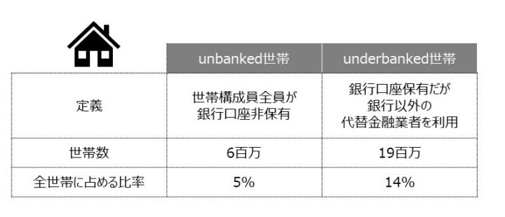 また、銀行口座は保有しているが銀行以外の代替金融業者を利用している「underbanked(アンダーバンクト)世帯」は1,900万世帯、実に全世帯の14%だ。なお代替金融サービスには、小切手の現金化、送金、ペイデイローン(給与日までのつなぎ資金に利用されることが多い、高金利な短期融資)などが含まれている。