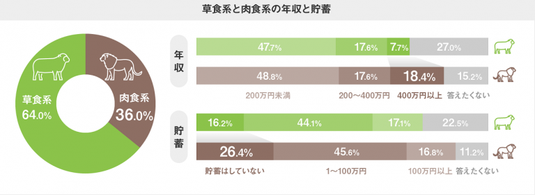 自分のことを肉食系と回答した若者は全体の36%。草食系と回答した若者は64%.。肉食系は草食系と回答した方より年収が高い傾向にも関わらず、貯金をしていない方が約3割。