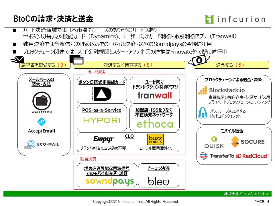- 「FinTechの祭典『FinovateFall 2015』 注目のサービスは『多機能カード』と『音波決済』」、CardWave2015年11・12月号