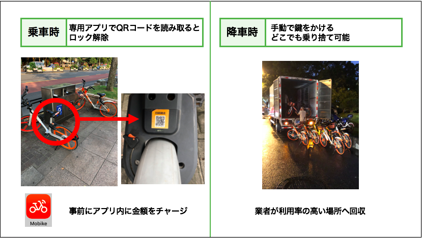 初めて使用した日の夜にちょうど見かけたのだが、適当に乗り置かれた自転車を業者が回収しており、駅前などの利用率の高い場所へ運ばれていた。