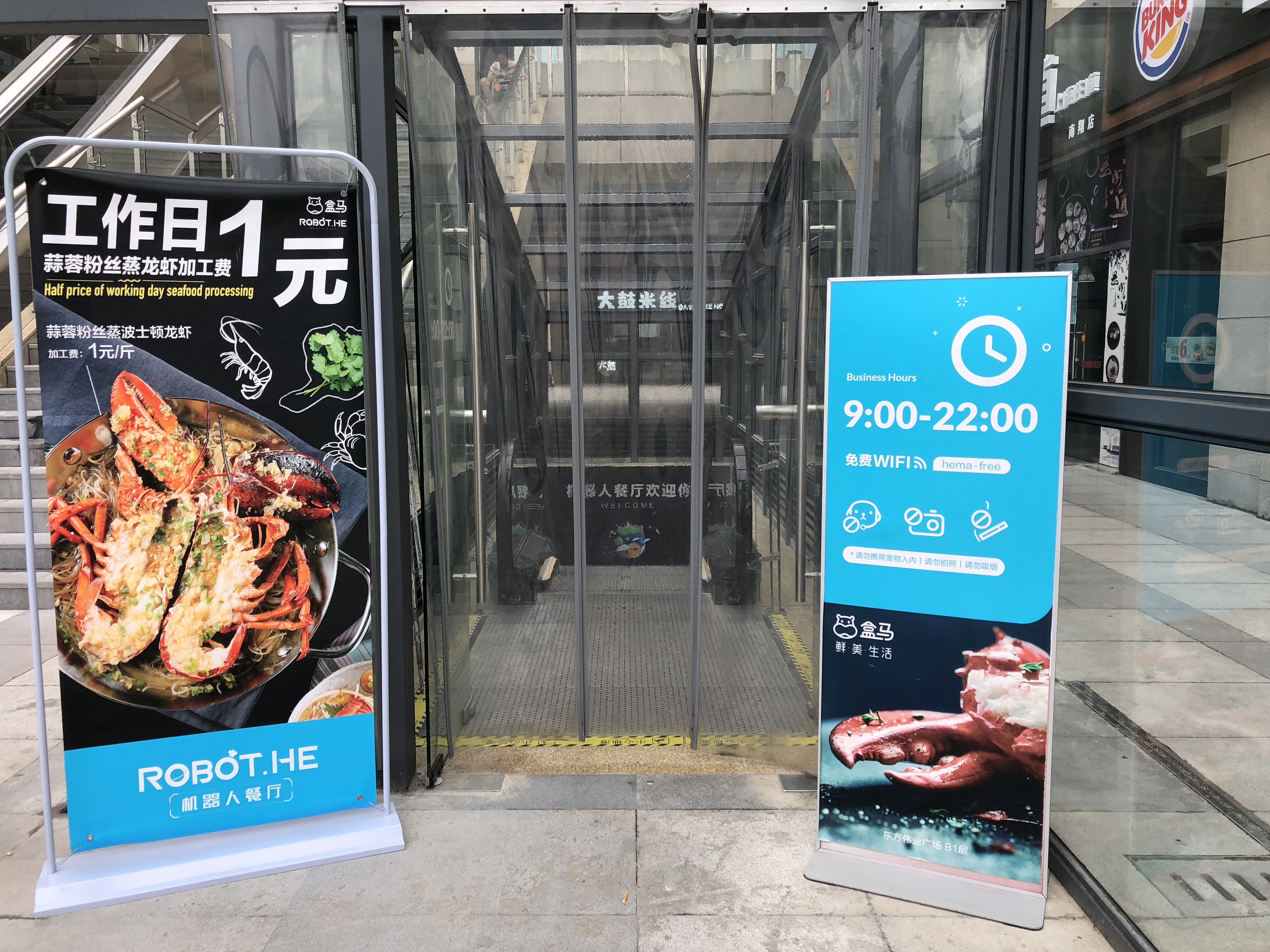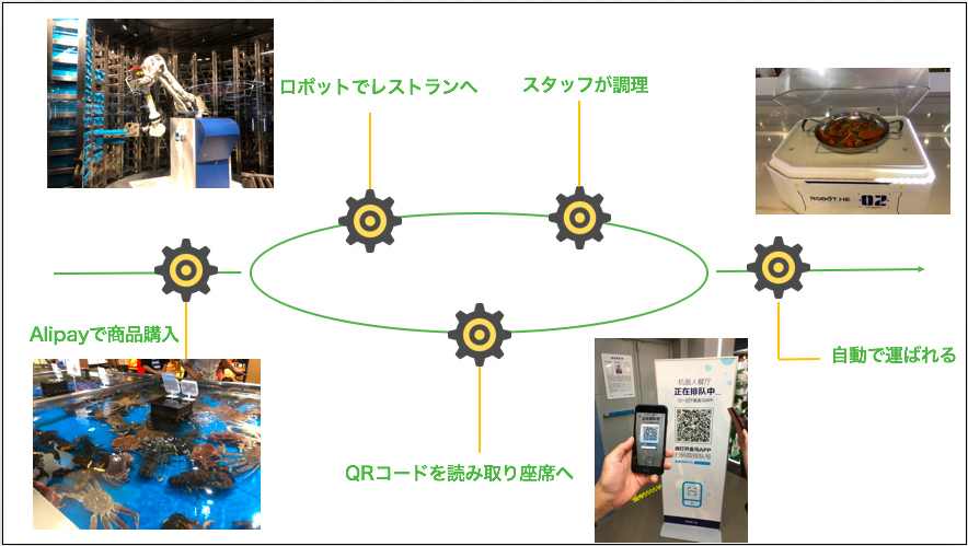 購入したロブスターとカニが自動ロボットにより横のレストランに運ばれる。レストランに入るときにAlipayのアプリで入り口にあるQRコードをスキャンし表示された座席に向かうと、座席にあるモニターには先ほど購入したロブスター達が調理中という表示になっていた。数分後には回転寿司と同じように料理がレーンに乗って自動で座席に到着。