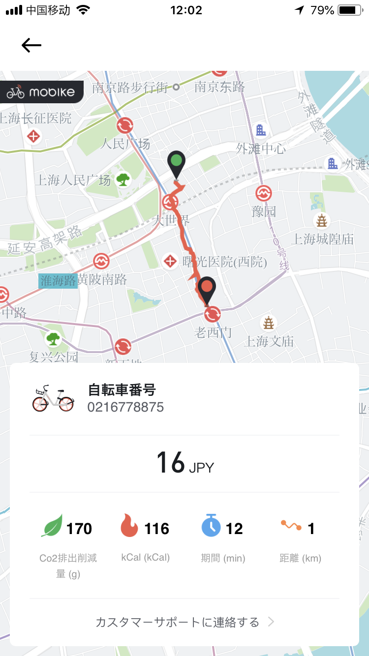 料金は実際の移動距離1km12分で16円と非常に安く、旅中のちょっとした移動はこれをいつも使っていた。利用した後にアプリ上では移動距離や金額、またCO2排出減量や消費カロリーなども確認することができる。懸念点としては、移動中はBluetoothをonにしなければならず、充電の減りが早いところ。それ以外は完璧。