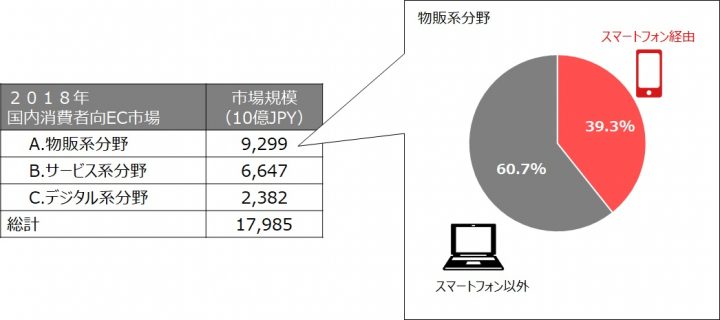 図表1:2018年の日本国内の個人向けEC市場規模と物販系分野のスマートフォン経由の購買比率(経済産業省「平成30年度電子商取引に関する市場調査」を元に作成)
