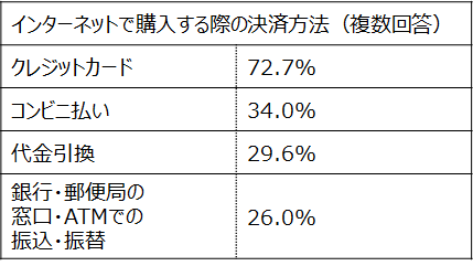 利用してる決済方法を複数回答で尋ねた結果です。クレジットカードがダントツ1位で72.7%。2位のコンビニ払いの34.0%を大きく引き離しています。
