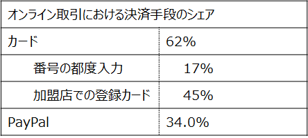 しかし図表3には面白いトレンドが表れています。1位はカード決済で62%。ここに驚きはありませんが、2位はPayPalで34%。そして、カード利用を、「番号の都度入力」と「加盟店での登録カード」で分解すると、PayPalのシェアは「都度入力」の17%を大きく超えており、「登録カード」の45%に迫っています。「一度カード番号を登録したら、もう番号入力は不要」という利便性での戦いが繰り広げられているのです。