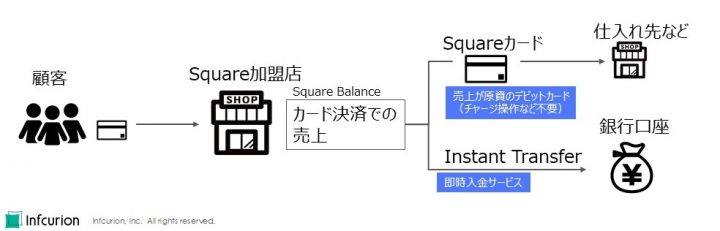 通常では、「Square Balance」の売上は、定められたタイミングで加盟店の銀行口座に入金されます。もっと早いタイミングで現金化したい加盟店は、「即時送金サービス(Instant Transfer)」を活用することもできるのですが、「Squareカード」を使うと銀行口座入金をバイパスして、「Square Balance」の売上をそのままデビットカード決済の原資に充てることができるのです。