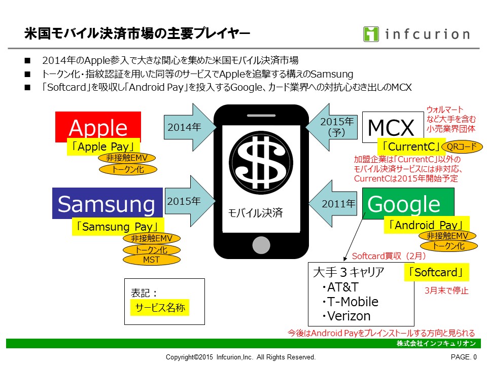 モバイル決済にはSamsung、Google、MCXもサービスを投入していく予定で、米国モバイル決済市場はさらなる盛り上がりを見せていきます。これらのサービスの日本上陸時期はまだ未公表ですが、水面下では様々な動きがある模様。日本のモバイル決済の将来を考えるうえでも、米国動向からは目が離せません。本稿では、これら米国モバイル決済の主要プレイヤーの動向を紹介します。